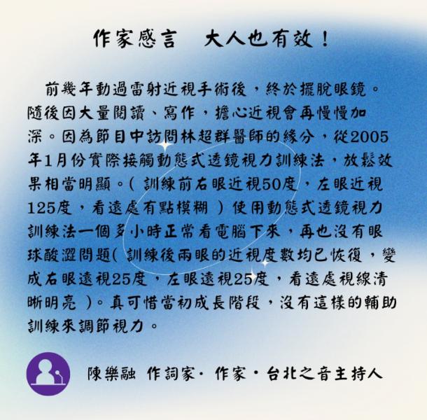 這種新方法叫作[動態式透鏡視力訓練法]是用凸透鏡使睫狀肌放鬆,稜鏡使兩眼外展,只要訓練1~2小時即能解除眼睛的酸痛症狀。建議每天看電腦螢幕6個小時以上的電腦族,可準備一台訓練機,於每天工作的同時戴上一到兩小時來放鬆眼睛即可避免發生〔電腦終端機視覺症候群〕,也是長期保養眼睛的好方法。